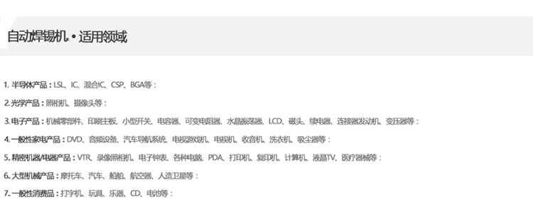 合用于(yu)汽车电(dian)(dian)子,数(shu)码,电(dian)(dian)子,电(dian)(dian)声,LCD,,线(xia♋n)路(lu)板等出产行业,毗连器(qi)、R]/收集(ji)变压器(qi)、排线(xian)、FPC♍B拉焊(han)、COF拉焊(han)、电(dian)(dian)脑主板、CABLE、喇叭和马达等高品(pin)质焊(han)接。